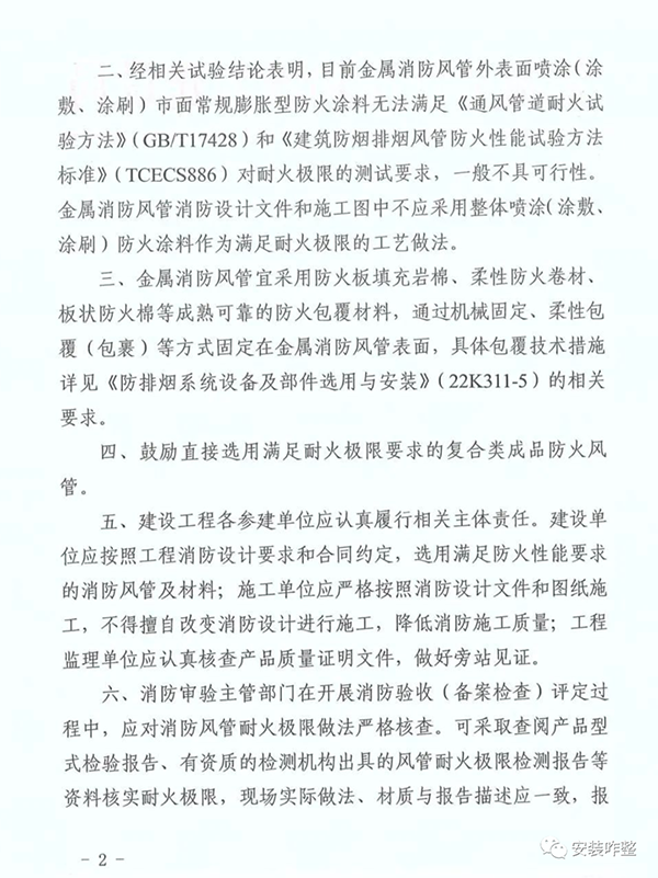 蕪市建函[2023]172號《關(guān)于規(guī)范新建工程消防風(fēng)管耐火極限做法的通知》