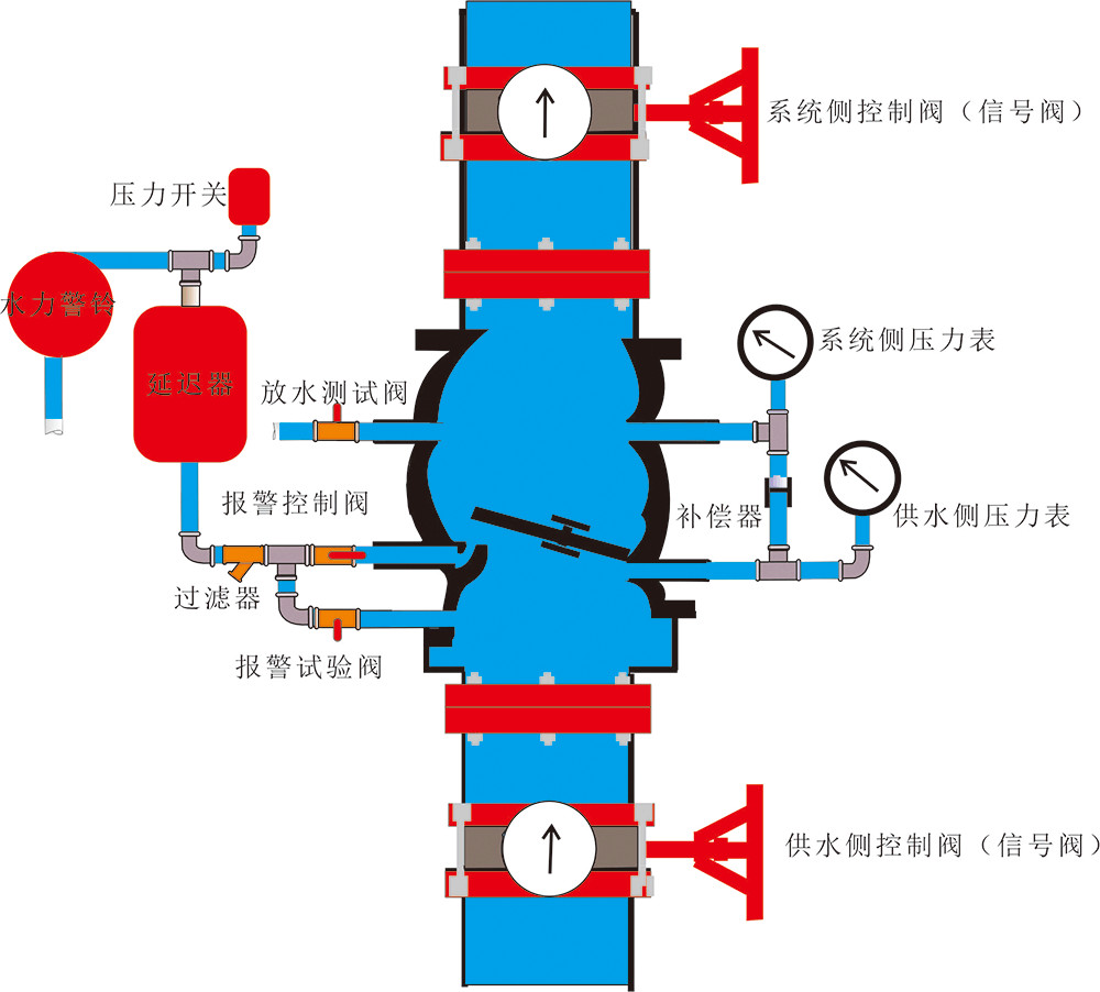 濕式報警閥體、系統(tǒng)側壓力表、供水側壓力表、補償器、放水測試閥(常閉)、報警控制閥(常開)、報警試驗閥(常閉)、過濾器、延遲器、壓力開關、水力警鈴